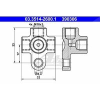 Ate Verbindungs-/Verteilerstück, Rohrleitungen 03.3514-2600.1 Anschlußgewinde: M10x1 Form: T-Form (T-Stück) Befestigungsart: Flanschbefestigung Anschlußanzahl: 4 Lochabstand 1/Lochabstand 2: 17,0/33,0 Länge [mm]: 32 Bohrung-Ø [mm]: 8,4 Gewindemaß: M10x1 Gewindeausführung: DIN 74235 Form FL OE Nummern: Mercedes-benz: 0004285024, 0004285424, A0004285024, A0004285424 Steyr: 7002360021 Vag: 200611755